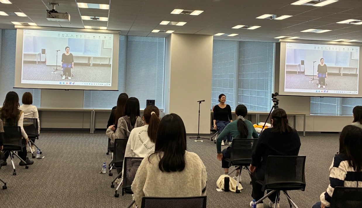 会場では、前方にインストラクターを配置しておりますが、スクリーンを使い、よりポーズが見やすく表示していただきました。